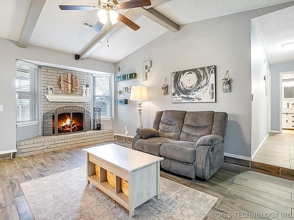 Back on market at no fault of the Seller! Appraisal complete, title work complete. Discover updated comfort in this adorable Glenpool Home. Located in the heart of the rapidly developing Glenpool area, this 3-bed, 1.5-bath Home offers updated hard surface flooring through nearly all of its 1,212 sqft. Step into the spacious living room with a vaulted ceiling, creating an airy atmosphere perfect for relaxation and entertaining. The kitchen boasts a gas range, granite countertops, stainless steel appliances, and ample pantry storage. Functionality meets convenience in the spacious indoor laundry room! Stay secure with a video doorbell, Kwickset exterior door locks with a Bluetooth smart deadbolt on the front door, and smart thermostat. Extra insulation added throughout attic for lower utility bills! AT&T fiber internet is available. Storage shed in backyard. All backing to a BEAUTIFUL Greenbelt. Don't miss out - schedule your viewing today!