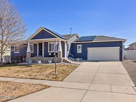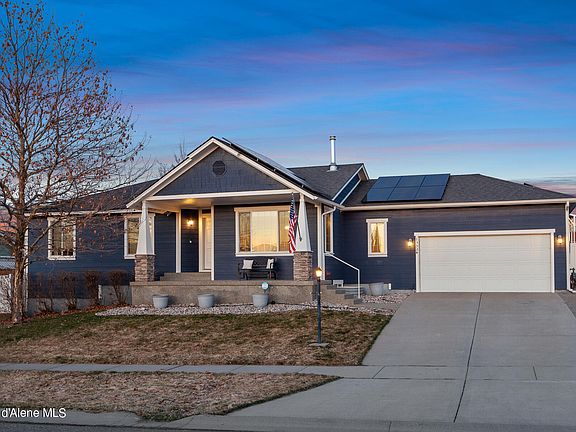 Spacious 5 Bed, 3.5 Bath Rancher with a fully finished basement centrally located in Rathdrum, close to Lakeland Schools, STEM, KTECH, parks & all amenities. Features include: New energy saving solar panels, new RV Port with power & 10' drive-through gate, new LED lights & cordless blinds, LVP flooring & plush carpet throughout, new hot water heater, gas HVAC & AC, open kitchen w/SS appliances & granite countertops, vaulted ceilings, light & bright open floor plan, wood burning stove, abundance of windows, storage galore, gigantic family room, new exterior paint, covered front porch w/stone accents, large .31 ac lot, fully fenced with sprinklers, shed, garden beds, coop and room to grow! This one is move-in-ready!