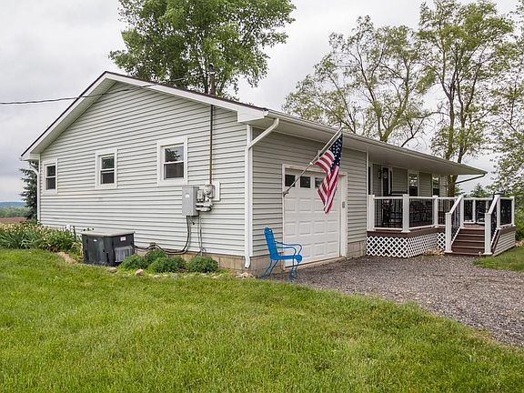 Sweeping vistas of your 12 acres from this hilltop ranch with large master (former 3rd bedroom combined with master). Immaculately maintained, spacious kitchen/eating area with stainless steel appliances, hickory wood floors. Updated bathroom, comfortable hot water baseboard heat, updated electrical, whole house generator, attached 1 car garage, Trex porch, deck out back. 40x80 concrete floor pole barn, 220 elec. heating and AC, 3 roll doors.