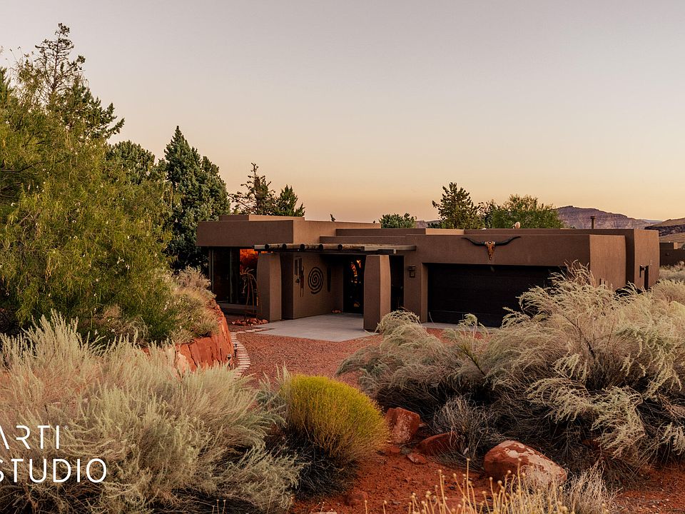 Welcome to a stunning single-level home at the base of the Kayenta red rock mountains in Ivins. This 2,400 sq ft custom residence is a celebration of craftsmanship and southwest elegance with hand-finished log ceilings, a signature red rock accent wall, and niches with art lighting. The gourmet kitchen offers two-tone cabinetry, stainless appliances, and a 9-ft hand-carved island with resin inlay. Two oversized master suites feature spa-inspired baths, walk-in closets, and private climate control. A spacious sunroom with retractable glass doors expands to a private backyard with gazebo, stucco privacy wall, and meticulous low-maintenance landscaping. Schedule your private tour today and experience the beauty of Kayenta living.