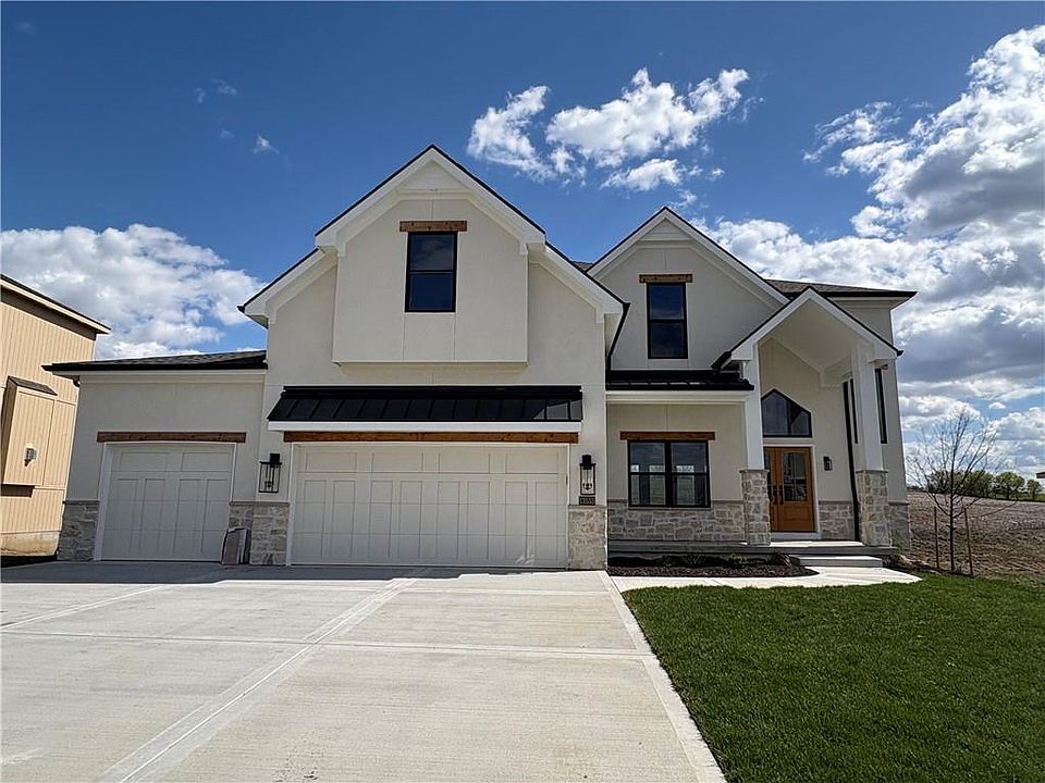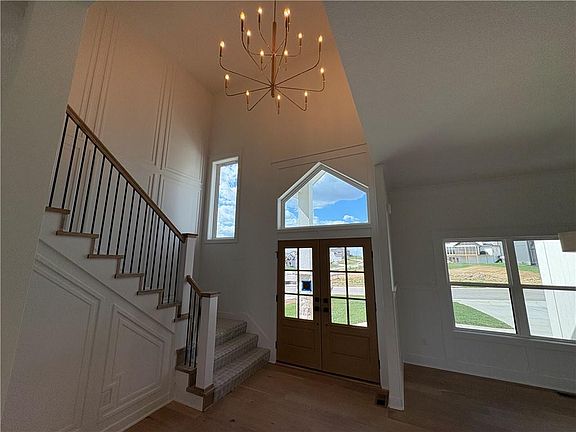 The coveted Perry II floorplan by Integrity Home Builders has been elevated to a new level on this fabulous walk-out lot in Prairie Field. With signature black windows & cedar trim, the Perry II is a stand out driving down the street. The grand double door entrance lead into clean crisp lines, 10' ceilings & hardwoods spanning throughout the main level. The kitchen centerpiece TABLE ISLAND sits grand surrounded by tall, stately custom cabinetry with soft close drawers all topped with quartz. True to IHB style, a perfect mix of both natural wood & painted cabinets plus the bell hooded gas stove & upgraded lighting set this home apart from other new construction. Ideal flow through to great room, breakfast room or formal dining plus an easy step outside onto the covered composite deck to catch the breeze and relax! The second level features owner's suite with beams in vaulted ceiling and a luxurious bathroom decked with dual vanity, free standing tub & fabulous stone/tiled shower. The closet does not disappoint... spacious & plenty of built-ins! Secondary bedrooms are generous in size with a double vanity jack & jill bath shared between a couple and the third bedroom having its own private full bath. Laundry room conveniently located near all bedrooms. Walkout basement for room to expand! The thoughtful design leaves no detail missed in this high class home in Prairie Field subdivision. Kearney address LIBERTY SCHOOLS!