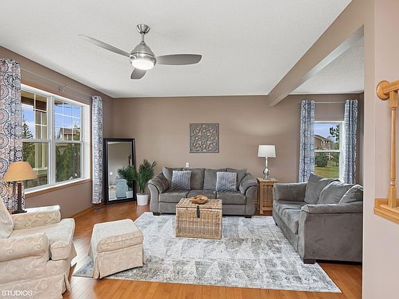 No reason to build! No wait! Incredible move-in ready two story! Two-minute drive to the new Emerald Trail Elementary school Fall 2025! Completely finished all levels with superb landscaping and private treed lot all year round! All rooms are generous in size. Meticulously maintained you'll find it in impeccable condition! Covered front porch will greet you. Hardwood floors for foyer and living room as you enter. Spacious kitchen, dining and family room open to an engaging, vaulted four season sunroom. Kitchen boasting beautiful maple cabinetry, a large granite center island and loads of counter space, enormous walk-in pantry plus stainless appliances including a double oven. Corner sink looks out to beautiful backyard. Space for a dining table as large as you want! Comfortable adjoining sitting area makes the great room so nice for everyday living and ability to entertain many! Enjoy the outdoors from the sun-drenched, vaulted sunroom and walk out to raised patio design that wraps around house to garage. Conveniently located powder room, mud room and laundry complete the main level. Wonderful, open layout for the upper level. Grand in size, the vaulted primary bedroom offers treetop views and a huge walk-in closet (11x10) with window! Private full bath has double sink raised vanity, deep soaking tub and separate step-in shower. Along with three other bedrooms and a full hall bath enter double doors to large (21'8x13'5) office or fifth bedroom! Terrific space for so many uses - study area, game room, library, music room, guest space! Moving on down to lower level you'll be pleased to find a casual/comfortable recreation room, game area, vibrantly designed 3/4 bathroom and large exercise room. Sellers leaving the Bodycraft Strength Training System and Horizon Fitness 7.8 AT Treadmill. Extra room plumbed for a wet bar/speakeasy. Endless storage space all levels and garage. The garage is amazing-full three car plus a bump out on 3rd stall. Sheetrocked, finished, and insulated. Attached shelving all around. ISD 196 and new the schools a real plus! Minutes to shopping, coffee, dining, parks and trails. Truly a home you'll be proud to call your own!