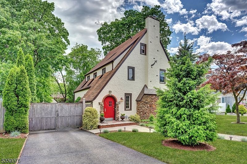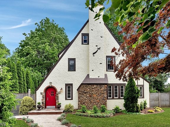 Welcome to this stunning four-bedroom, two full bath, and one half-bath classic Tudor style home located in one of Plainfield's most desirable East-end neighborhoods. Built in 1926, this stucco and stone front home boasts many delightful original details throughout, offering a charming step back in time. Key Features: gable roof line, archways, wood floors, spacious 2,100 sq ft floorplan. Entry foyer with coat closet and a powder room. First-floor den/family room. Elegant living room featuring a brick-front woodburning fireplace. Bright and airy formal dining room. Modern eat-in kitchen with granite countertops, stone tiled backsplash, beautiful wood cabinetry, stainless steel appliances including a GE four-burner gas stove-top, microwave, dishwasher, side-by-side refrigerator, recessed lighting, undermount stainless steel sink and wine cooler. Second floor houses three bedrooms, including a spacious primary bedroom and one beautifully updated full bathroom with dual sinks, heater and frameless glass enclosed shower. Third floor offers one-bedroom, full bath with tiled tub/shower, quaint sitting area and attic storage. Additional features include: one-year APHW Warranty, wood blinds, handsome brick paver patio, fenced backyard, mature landscaping, whole house fan, ceiling fans, hot tub and alarm system "as is", French drains and sump pump, Thermoflow boiler with hot water radiator heating system, LG washer and dryer, thermal pane windows and a two-car garage with openers.