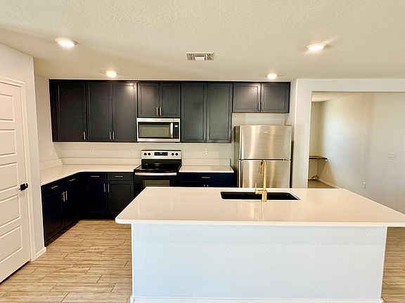 This charming single-story home features and open floor plan with 9-ft. ceilings and an expansive great room with access to an oversized covered back patio. You'll find beautiful wood plank tile flooring throughout the common areas and carpet in each bedroom. The kitchen boasts beautiful navy blue 42-in. upper cabinets with gold hardware, a center island, and beautiful quartz countertops. The private primary suite, located at the back of the home for added privacy, includes an oversized closet, and the primary bath boasts a walk-in shower and a raised dual-sink vanity. This home also has a large den/affice area with built in custom cabinets. This energy efficient home also includes a soft water loop, 40-gal. water heater and an energy efficient A/C system with Wi-Fi-connected smart thermostats.