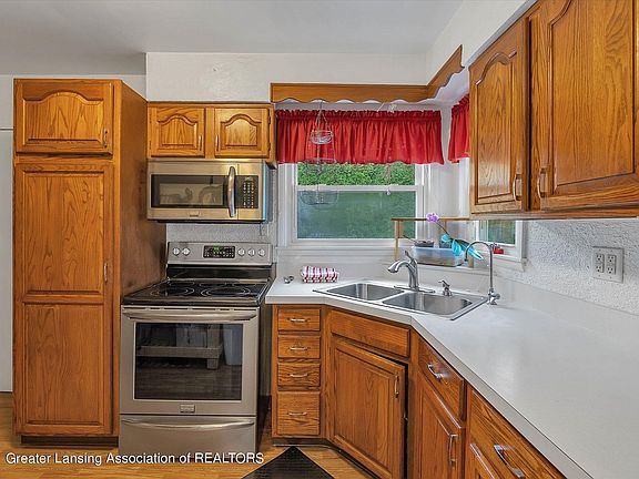 Wonderful home listed in DeWitt township (low taxes) and in DeWitt schools, great location, 1354 W Webb. Convenient ranch style home, entering the front door admiring the hardwood floors in the living room and the masonry fireplace and adjoining dining room. The kitchen is well designed with cabinets, countertops and stainless steel appliances. Three bedrooms on the main floor with hardwood floors. The lower level has a large family room, work room and another room that could be used for study or exercise room. The yard is amazing over half acre with mature trees, fenced yard, playhouse, shed and a large walkout 16 x 18 deck for entertaining. Location close to highway, shopping and restaurants.