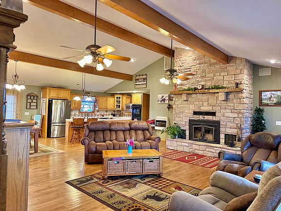 Rare find! Custom built home on 10 acres m/l with a shop! Step into this quality built home, and this is what you will find: This OPEN concept main living/kitchen/dining area is HUGE, and is the perfect space for a family to gather. Check out the beamed 13' ceiling, and awesome fireplace that is circulated with the furnace. The kitchen has a double oven, counter space galore, tons of cabinet space, and a pantry! The beautiful flooring you see is 3/4'' oak hardwoods! This home offers a split bedroom plan, with the master suite and walk in closet tucked away for privacy. 3 bedrooms and an additional full bathroom offer plenty of space for a growing family. Spacious laundry area and a half bath round out this great floor plan. **** Average electric bill runs around $30/month with the 14.4KW GROUND SOLAR PANEL system!!! Also, some other highlights of this home: New roof 11-2020, Solar installed 3-2020, attic fan, and surround sound, solid oak entry door with leaded glass, and Hot Tub. Don't forget the 48x45 SHOP for the man of the family! Call for your private showing.