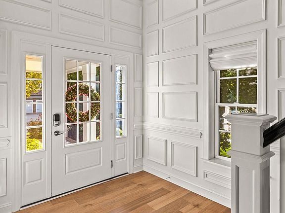 The first floor showcases a beautiful wood-paneled entryway, a separate den with French doors, a formal dining room, and a spacious living room. The impressive kitchen features quartz countertops, a Bosch gas cooktop with pot filler, a porcelain farmhouse-style sink, undermount lighting, and stainless steel appliances. This home is perfect for entertaining with its separate butler's pantry offering extra counter space for food prep, a bar sink, and a built-in cabinet and storage system. The formal dining room includes a built-in hutch and serving station—an ideal floor plan for the holiday season.