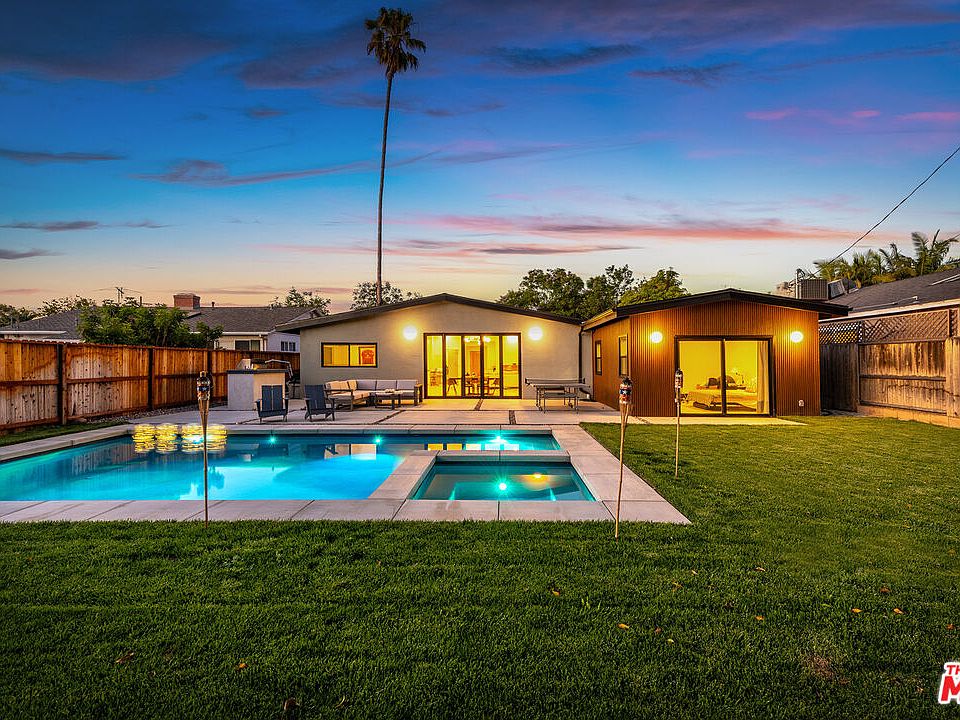 Welcome to this beautifully reimagined home, set on a renowned jacaranda-lined street in one of Sherman Oaks' most sought-after neighborhoods. Sitting on an expansive 9,500+ sq. ft. lot, this 5BD/4BA residence was completely rebuilt in 2024 with meticulous attention to detail.Inside, elegant white oak floors, soaring 12-foot vaulted ceilings, custom cabinetry, and two oversized skylights create an airy, light-filled atmosphere. The chef's kitchen features luxury appliances, a walk-in pantry, abundant storage, and a striking center island, seamlessly connecting to the main living area. Accordion glass doors open wide to the backyard, blending indoor and outdoor living.The primary suite offers a spacious walk-in closet and a spa-like en suite with a double vanity, freestanding soaking tub, and terrazzo floors.The resort-style backyard is an entertainer's dream with a custom BBQ station, sparkling pool, spa, and ample space for gatherings.Perfectly located within the highly coveted Dixie Canyon Community Charter Elementary district and just minutes from The Shops at Sportsmen's Lodge, Casa Vega, and Ventura Blvd dining, this home is the ultimate blend of comfort, convenience, and California living.