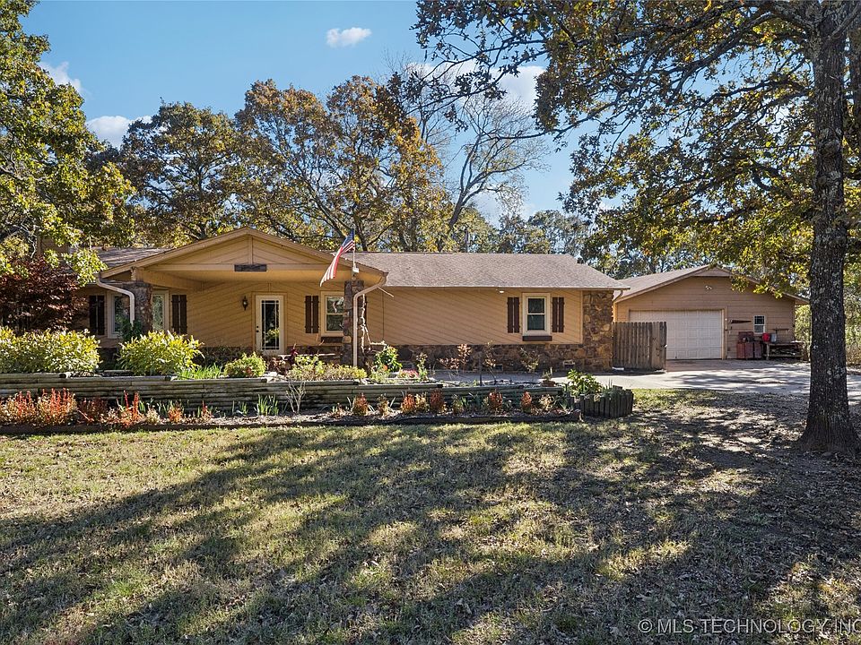 Private Retreat or Mini Ranch with pond! 1-Story Ranch Style home 4 Bedrooms, 3 full Baths on 2.5 Acres (m/l) with Pond, Shop & Dual Primary Suites! Escape the city without sacrificing convenience just minutes from town! An amazing floor plan with wide hall and 2 split Master Bedrooms with en-suite bathrooms and walk-in closets. Crown molding throughout. Vaulted ceiling. A True Concrete Safe Room with ventilation. Custom Carport at the front door, New Champion Double Hung Windows throughout the house for amazing whole home ventilation. Screened in porch off the Dining room and master bedroom. Large Dining room open to the kitchen and the living room. Great Size living room with great natural lighting and a large sliding window and a wood burning fireplace. Great Decks for morning coffee and entertaining. Screened in porch wired for hot tub. Large 3 car shop with private insulated office. So many flower and garden beds – with drip irrigation and watering systems installed. Chicken coop and an area that is fenced in for sheep / chickens / livestock or a dog kennel. Check out this amazing floor plan!