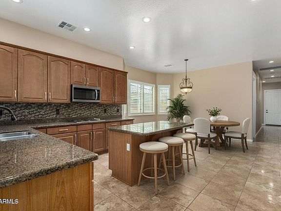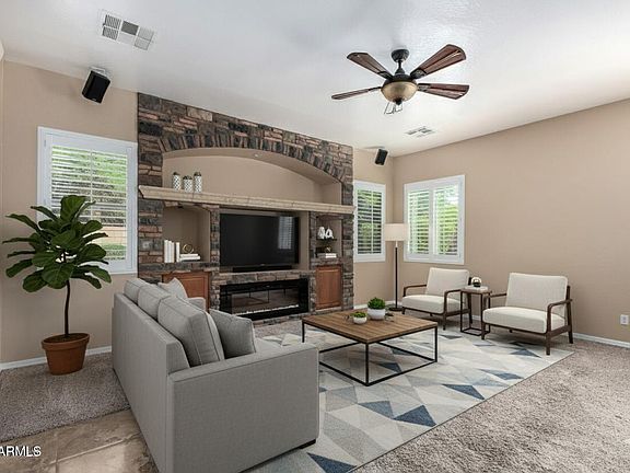 Gorgeous 4-bed, 2.5-bath home on a spacious 10,000+ sq ft lot with no neighbors behind! This thoughtfully designed split floorplan features soaring ceilings, plantation shutters, granite countertops, maple cabinets, double ovens, a custom built-in entertainment center, and built-in surround sound. The oversized primary suite offers a frameless glass shower, dual sinks, and huge walk-in closet. The versatile den makes a perfect home office or flex space. Step outside to a beautifully landscaped backyard with low-maintenance turf, garden beds, an RV gate, and a huge paver patio courtyard—ideal for relaxing or entertaining. Newer AC and a spacious 3-car garage round out this incredible home, just 2 miles from San Tan Mall, Costco, the 202, and Gilbert Regional Park!