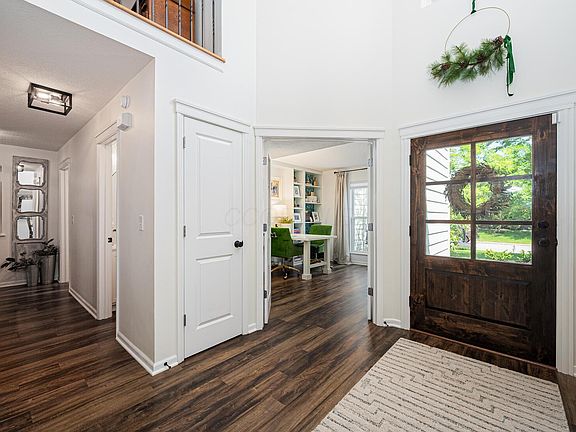 The main floor includes a private home office with custom built-in shelves and his/hers desks, a spacious formal dining room and a 2-story great room with a wall of windows, gas fireplace with brick surround, and views of the scenic backyard. The great room flows seamlessly into the updated kitchen with white cabinetry, quartz countertops, stainless-steel appliances, tile backsplash, built-in banquet and a cozy corner breakfast nook.