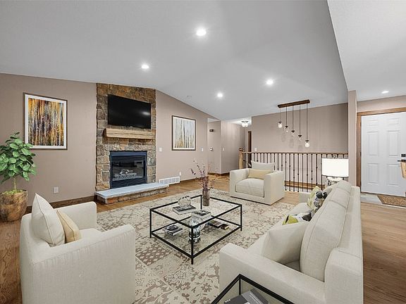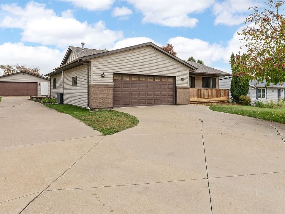 Rare in-town acreage with 1.04 acres, mature trees, attached and detached garages, and a completely refreshed and renovated main level in 2025. Open vaulted main living space with new solid oak flooring, new carpet, hand-built open railing, new lighting, and a beautiful gas fireplace with stone surround, timber mantle, and limestone hearth. Kitchen features solid surface counters, stainless drop-in sink, updated plumbing fixtures, 2025 Aristokraft cabinetry, and LG stainless appliance package. Updated main floor laundry with new cabinets, solid surface counters, and utility sink. Primary suite with oversized closet, built-in shelving, tiled shower with custom glass door, double bowl vanity. Solid oak paneled doors, newer trim/casements, new lever hardware, Kohler elongated stools, several new fiberglass exterior doors, and 2025 covered front deck upgrade. Attached 24' x 25' garage (16’ door) with a gas heater, workbench, service door PLUS 24' x 24' detached garage with separate electrical panel. Amana HVAC, vinyl siding, aluminum soffit, 2 water heaters. Lower level offers a flex room, bath stub, TGI system and expandable finish potential with walkout. Nixon / Harding / Kennedy schools. City convenience, acreage privacy, garage capacity, and a newly updated main floor that lives like new.