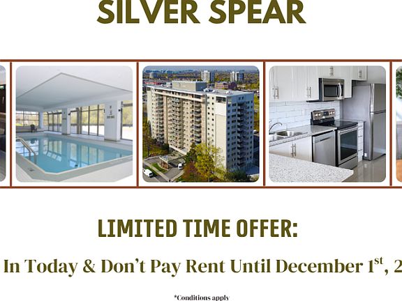 AboutClose to shopping, downtown, and many popular parks, Silver Spear apartment building is conveniently located in the Applewood area of Mississauga. Our 1 and 2 bedroom apartments and penthouse suites feature parquet flooring, balconies, spacious layouts, an indoor swimming pool, fitness room, and captivating views of the downtown Mississauga and Toronto Skyline. Silver Spear offers comfortable rental living with an easy commute by highway, bus, subway, or GO train.