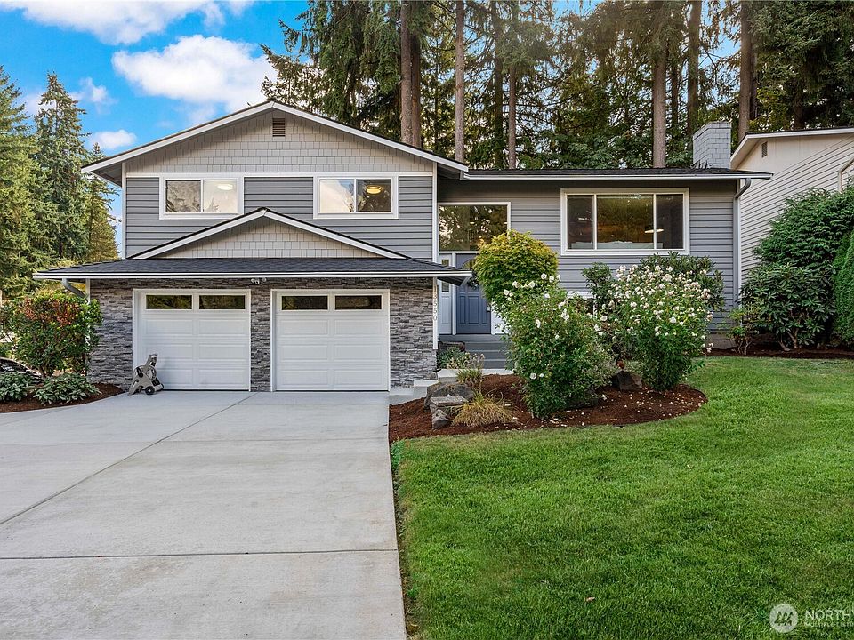 Welcome to your beautifully updated Kirkland corner-lot home backing to lush greenbelt privacy! Enjoy a spacious kitchen with granite counters, stainless steel appliances, and engineered hardwoods flowing through the open-concept living, dining, and kitchen—perfect for entertaining. Sun-drenched living room with large picture windows and floor-to-ceiling stone fireplaces on both levels. Upstairs features a primary suite with en-suite bath and three additional bedrooms. Two generous bonus/family rooms below with walk-out to the backyard oasis. Fresh interior paint, new driveway, AC for year-round comfort, and a freshly painted two-tiered deck overlooking serene greenbelt views with fenced yard. Minutes to Totem Lake, I-405, and Bellevue.