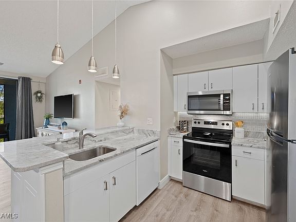 Move right in to this beautifully updated, 2nd floor 1B/1Ba, turnkey furnished condo w water views in Musa! Light & Bright End Unit with Vaulted Ceilings. Stunning Granite kitchen w/white cabinetry, newer appliances including super quiet Bosch dishwasher! Updated LVP flooring & custom lighting thru out, updated bath, Newer ht wtr htr & AC 2021. Newer tasteful furnishings are all included. Conveniently located just steps to the clubhouse which features 2 pools, tennis, pickleball, fitness, basketball & clubhouse for social events. Super Low Condo fees just $283/mo and Low County Taxes! Optional Storage unit $25/mo. Great complex located off of Daniels Parkway near 6 Mile Cypress nature preserve, Whole Foods Complex, Restaurants & Shopping, Gulfcoast Hospital & medical, Minutes to SWFL Int'l airport & short drive to nearby Eagle Ridge golf course and area beaches! Hurry! This is a beauty, move in ready and a great place to enjoy the best of SW Florida either for the season or year round!