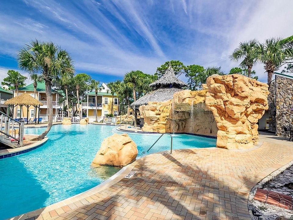 A vacationers dream! Ready to move in, cozy 1 bedroom Caribbean style condo right in front of a beautiful pool complete with waterfall & Tiki Bar. Enjoy a front row view from the comfort of your private screened in porch. A real resort, waking distance to the Gulf. Perfect as a year round personal getaway or a potential rental.