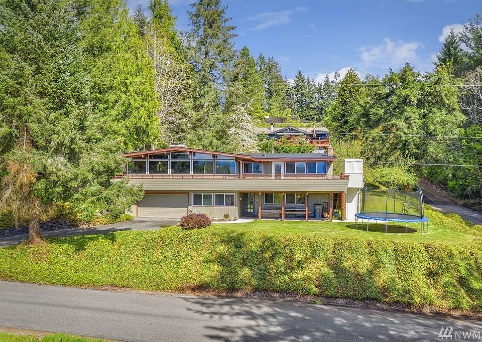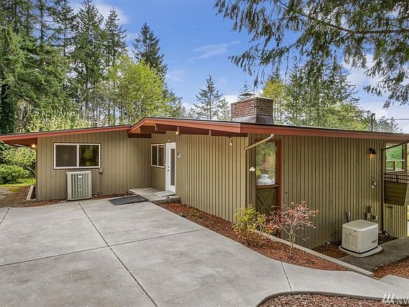 Striking Mid-Century modern daylight rambler w/ Olympic Mountain View! This CK home is fully ADA accessible w/ an exterior elevator system. Bright & airy, this classic beauty offers vaulted ceilings, hardwood floors, spacious & open living & dining areas w/ fireplace + west facing wall of windows w/ view. Stainless appliances. Remodeled master bath. Huge lower level family room w/ new laminate flooring, woodstove, 4th BR & 3/4 bath. New roof. Trex decking. Heat pump. 16KW "Generac" generator.