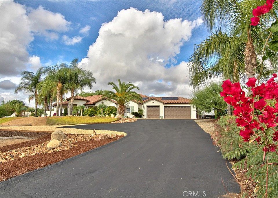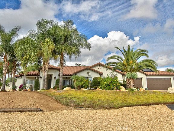 Discover your new lifestyle at this beautifully appointed single story Valley Center home on over 2 acres in the prestigious community of Orchard Hills. This 4 bdrm, 3 bath home is in immaculate condition and will delight the fussiest buyers with an endless list of quality upgrades. Upon arrival your greeted by the custom wrought iron driveway gate surrounded by a row of towering olive trees full of character and history. Palm trees and flowers line the driveway that lead you up to the home. Inside, the kitchen features granite counters, 36" BlueStar Platinum Range, Zephyr range hood, double ovens, top of the line Bosch dishwasher and built in microwave. Other other custom interior upgrades include crown moulding throughout, Restoration Hardware dining room chandeliers, high end ceiling fans and lighting, updated electrical, new interior premium Matte paint, custom plantation shutters, shades and draperies. Also included are the whole house soft water system and seller owned newly installed Enphase solar system (installed July 2022). The backyard oasis will relax your senses with cool hilltop breezes, tropical landscaping, custom pebble-tec pool/spa, vinyl privacy fencing and established hedgerow for total backyard seclusion, large lawn area, California room, propane lava rock fire pit and outdoor speaker system for relaxing and entertaining. The exterior of the home is in pristine condition with every detail thought of, including custom faux copper rain gutters with collector buckets at entry, copper rain chains and plumbed and wired for front entry water fountain. The landscaping and yard explodes with colors, especially spring and summer. Dry river bed flows through the property surrounded by established hardy plants and flowers that return every year, all cared for by an automated 30 station irrigation drip and micro-spray system. Plenty of parking with a full 3 car garage, carport as well as abundant paved and gravel areas for RV or other excess utility vehicle parking. The full driveway was recently maintained and refinished with a double coat of top quality commercial asphalt. As an additional bonus this property comes with a full set of San Diego county approved plans for a 716 s.f. ADU with attached covered carport, just reopen and submit septic plan and your ready to build. Onsite 1000 gallon propane tank owned and serviced by Ferrell gas. Country quiet, close to schools, shopping, restaurants.