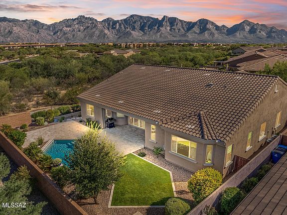 Step outside to your private backyard paradise a modern geometric pool with stacked-stone water features and symmetrical raised planters, creating a tranquil resort-style escape framed by Catalina Mountain views. Surrounded by lush desert landscaping, mature citrus trees, and multiple seating areas, this home is an entertainer's dream. The covered patio extends the living space outdoors, offering the perfect spot to relax or host gatherings under Arizona's endless sunshine.