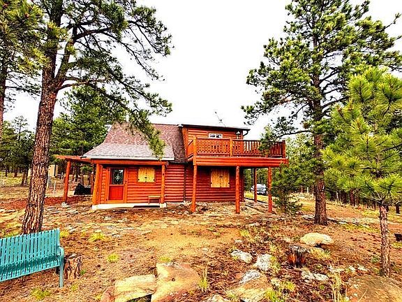 Storybook picture perfect, mountain retreat in a serene and beautiful location, 5 acres of very usable land. Perfect for horse lovers, ATV riders or make it your bug out shelter. The adorable home has 1 bedroom on the main floor and a 2nd in the loft above. Tongues and grooves ceiling, easy maintenance with acid wash concrete floor. French doors to a dog run/garden area and a free standing wood stove for cozy winter nights. The semi wrapped around upper deck is ideal for stargazing or to enjoy the big Open views. Seller will even include the furniture. Do not wait, call today and come enjoy Colorado's blue skies for your new piece of paradise.