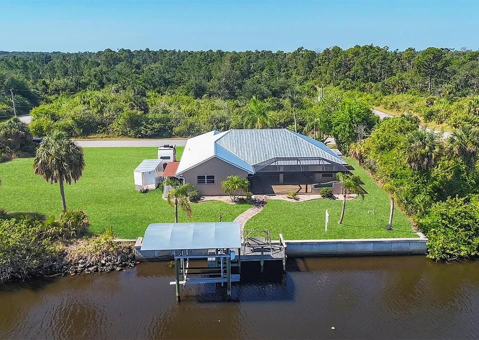 Covered boat liftLarge granite top islandMetal roofNew paintPaver pathGuest bathOpen floor plan