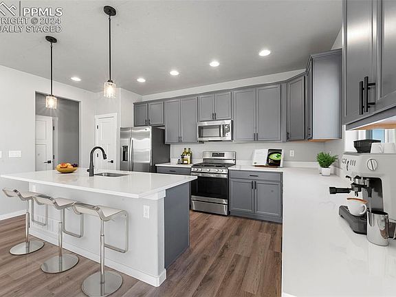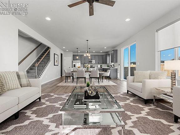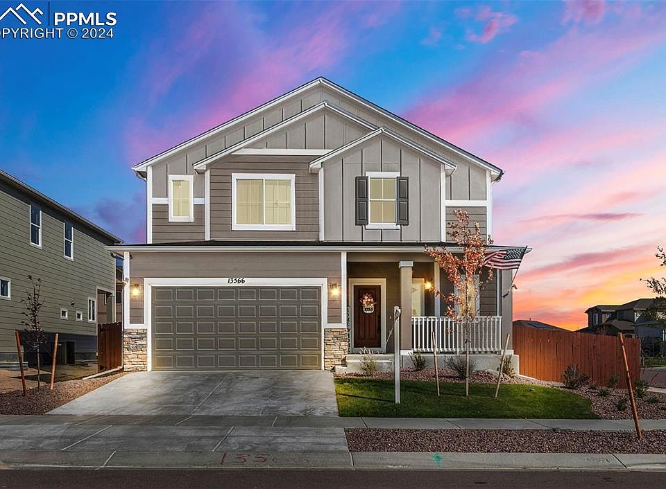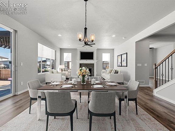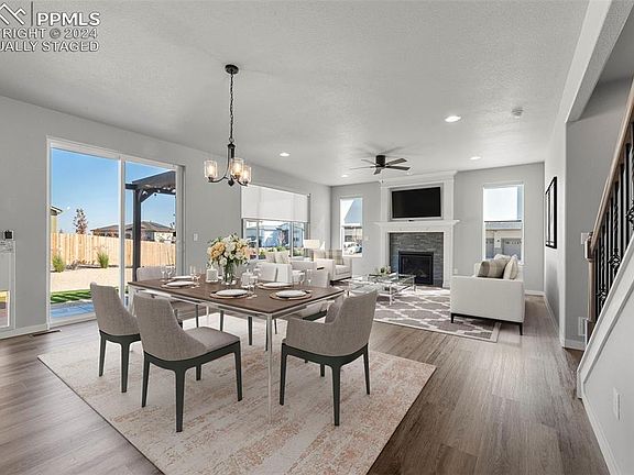 **Assumable Loan** Welcome to Rolling Hills at Meridian Ranch, where this beautiful single-family home situated on a large corner lot awaits you! Built in 2023, this spacious home with attached 2 car garage offers 3 bedrooms, an office, loft, 2 baths, and 1 powder room, providing ample space for comfortable living. This home boasts an array of desirable features, including stainless steel appliances, quartz countertops, designer upgraded cabinets, large kitchen island, a gas fireplace with blower, luxury vinyl plank floors on the main and upper level, adding a touch of elegance to the space. The attention to detail is evident throughout the home, with beautiful finishes and thoughtful design elements. The first floor features an open floor plan with a dining area, an office with kitchen, powder room, living room, with access from the living area to the fully fenced and landscaped back yard with a large concrete patio and custom lighted pergola. The home is equipped with a programmable sprinkler system to keep your low-maintenance landscaping looking lush with minimal effort. A wrought-iron modern staircase leads to the upper floor featuring a large primary bedroom and en-suite bathroom with dual vanities, a walk-in shower with river rock, and walk in closet, a loft, laundry room, and two additional bedrooms. A stunning view of Pikes Peak can be seen from the loft area and the second bedroom. The basement has rough-in plumbing and is ready for your finishing touches. Living in this home grants you access to a variety of amenities within the community, such as walking trails, a pool, a public golf course, and local shops and restaurants. You can enjoy an active and vibrant lifestyle without ever leaving your neighborhood. Experience the perfect blend of comfort, style, and convenience in this wonderful home! Contact us to schedule your private viewing today.