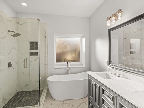 Upgraded carpetModern led square lightsWaterfall peninsulaSquare tile flooringQuartz countertopsOversized covered back patioFreestanding soaking tub