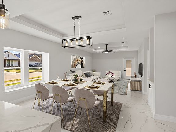 Welcome to 1357 Beach Drive in Pelican Bay, TX – a standout new construction just minutes from Eagle Mountain Lake, built with elevated craftsmanship and above-builder-grade finishes throughout. This thoughtfully designed home features 9' walls, 10' tray ceilings in the living and dining areas, and a 12' ceiling in the foyer with chandelier. The exterior boasts full spray foam insulation (walls + attic), 30-year shingles, OSB sheathing with Tyvek wrap, and decorative brickwork. An oversized covered back patio with ceiling fan provides the perfect outdoor retreat. Inside, enjoy square tile flooring in main areas, upgraded carpet in bedrooms, modern LED square lights, and remote-controlled ceiling fans. The kitchen features quartz countertops with a waterfall peninsula, white shaker cabinetry, and a full fridge enclosure. The primary suite includes a freestanding soaking tub, marble-tiled shower with seamless glass, Carrera marble vanity, and framed mirror. All doors are solid-core shaker with modern square brushed hardware. The secondary bath also features a walk-in shower, high-end vanity, and Carrera marble top. Even the garage is finished, insulated, and includes LED lighting. No HOA. Built for long-term comfort, style, and value—don’t miss your chance to make this your next home.