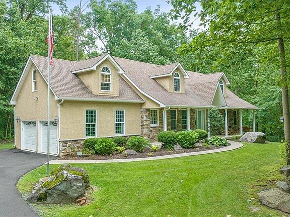 Welcome to a stunning retreat nestled amidst 3.3 acres of serene woodlands, where tranquility meets comfort! A long driveway adds to the allure, welcoming you home with a sense of anticipation and serenity as you wind your way through the majestic surroundings. Picturesque stone front facade and a welcoming covered front porch, this home exudes charm. Two-story stone fireplace. Culinary enthusiasts will delight in the gourmet kitchen, adorned with granite countertops, equipped with ample cabinet space. Enjoy the ultimate convenience and privacy of a first-floor primary bedroom retreat, complete with an updated luxurious ensuite bathroom. The second-floor open catwalk overlooks the first-floor family room, creating a sense of connectivity and spaciousness while allowing natural light to flood the interior. Two spacious bedrooms located upstairs, with large versatile bonus room, offer flexible living options. The full basement provides additional space for storage, recreation, or customization. Step outside onto the expansive deck and immerse yourself in the tranquility of nature, surrounded by wooded bliss, the deck offers a perfect retreat for relaxation and enjoyment. Two-car side entry garage. Shed offers storage space perfect for outdoor equipment, tools or recreational gear. Do not miss the opportunity to make this exceptional retreat near Lake Nockamixon your own. Schedule a private tour today and discover the serenity and beauty that await you in this remarkable home.