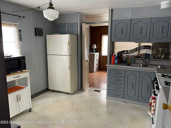 Mobile home on beautiful corner half acre wooded private parcel of Topinabee MI. Includes all appliances, including refrigerator in breezeway .Property has Fire pit, enclosed front porch, small bac kdeck and 10x10 shed. You are within One mile from public beach to Mullett Lake and boat launch. Walking distance to Topinabee market, Breakers Bar, and the popular Cafe Noka Restaurant.