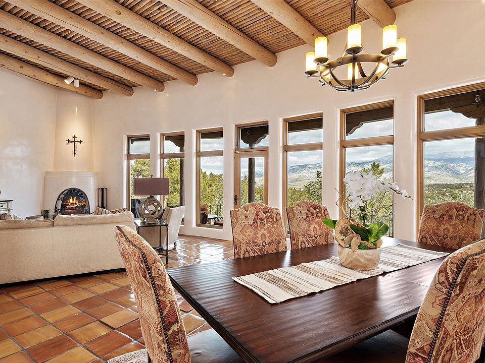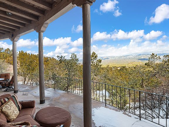 SANGRE DE CHRISTO MOUNTAIN VIEWS SPLAYED OUT IN ALL THEIR REVALRY FROM THIS 1.7 ACRE TANO ROAD HOME LOCATED ON COVETED CUL-DU-SAC LOCATION. Classical Santa Fe architecture meets modern day requirements including flexible space for bedrooms + office, city water and high-speed internet, excellent proximity to town and a Positive Energy solar system with battery back-up. Prull Builders built this extraordinary home which has been lovingly updated and maintained by the current owners. Designed by Paula Baker Laporte - the tranquil "arc" of the design allows one to "discover" the home - a new inspiration around each gentle bend. Fantastic floor plan allows for multiple outdoor spaces for entertaining and relaxing around the residence including a long portal maximizing the Sangre views, a large private walled courtyard with outdoor kiva fireplace off the den/kitchen area, balconies off corners of the primary suite and other bedrooms. Finally, an outdoor portal with a hot tub is in the perfect nook for privacy and views! Each bath has unique Talavera tile designs including a dazzling powder room. This home is the ultimate in Santa Fe living - honoring the integrity of Santa Fe style with today's modern amenities/energy savings.