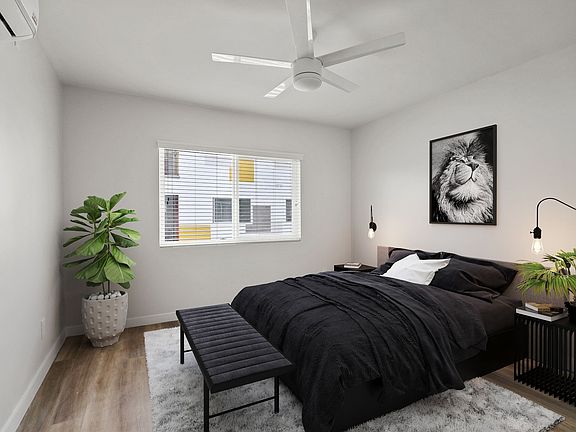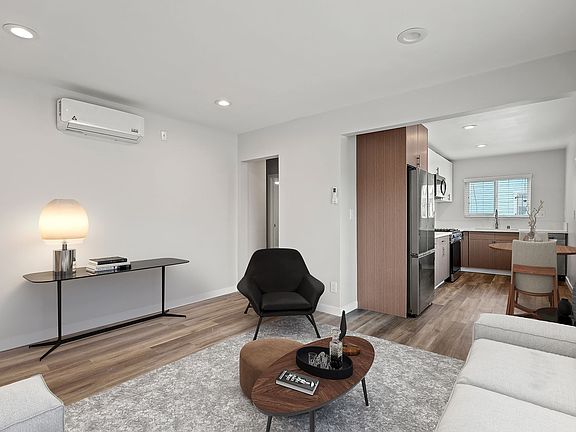 Carefully restored and designed by a renowned LA designer, these 1960s modern luxury rental homes feature keyless entry door locks to spacious one and two-bedroom floor plans with newly renovated kitchen and bathrooms. The kitchen boasts sparkling white stone quartz countertops with brand new self closing cabinetry and high-end stainless-steel refrigerators with matching gas cooktop with oven and microwave. iRing doorbells with a smart home video security camera are also included as well as a stackable washer and dryer. Bathrooms feature porcelain tiled bath tubs and glass shower doors. Each rental home also includes central A/C cooling and heating with recessed lights with luxury style cellular shade window blinds and distressed wood plank floors.