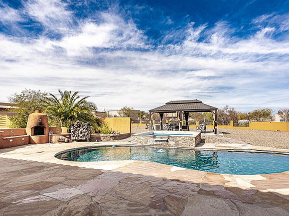 Step into the extraordinary RESORT-STYLE LIVING with this stunning home, complete with a CASITA and sparkling POOL, nestled on a spacious lot of nearly an ACRE in Mesquite Heights - all WITHOUT the constraints of an HOA! This home exudes impeccable taste, offering an effortless flow throughout its beautifully laid-out interiors. The Great room, bathed in a refreshing palette of light, showcases a cozy gas fireplace that seamlessly merges into the beautiful kitchen. Here, you'll find gorgeous granite countertops, a wealth of cabinetry, and a breakfast bar and nook - all complemented by top-tier, stainless steel GE Profile appliances acquired as recently as 2023! The separate formal dining area is ideal for hosting gatherings. The expansive Owner's suite is a sanctuary in itself, granting direct access to the backyard and a lavish en-suite bathroom featuring dual sinks and a spacious, tiled walk-in shower. The smart split floor plan also includes two extra bedrooms, a guest bathroom, and a versatile den that can effortlessly double as a media room or home office. Live life to the fullest in the sprawling backyard oasis. It features a shimmering pool with a shallow lounging area, Gazebo, a porch with rolling screens, and plenty and plenty of room to spare. The Casita, an extension of this home, is an inviting retreat for your guests, complete with an equipped kitchen, living room, bedroom, a walk-in closet with laundry facilities, and a bathroom with a walk-in shower. It even opens up to a private, turfed yard, providing the perfect nook for relaxation. 3 Car garage and RV parking allowed. This home doesn't stop impressing, with its bonus features like Wi-Fi enabled thermostats, a recently installed custom iron front door, a water softener system, contemporary light fixtures, and a paved driveway. Plus, it ensures your peace of mind with an alarm system (cameras excluded). Overall, this fantastic home is ideally situated close to shopping areas and provides convenient access to I-19. A remarkable blend of luxury and comfort, this home truly promises an exceptional lifestyle!
