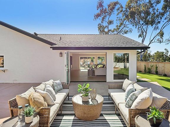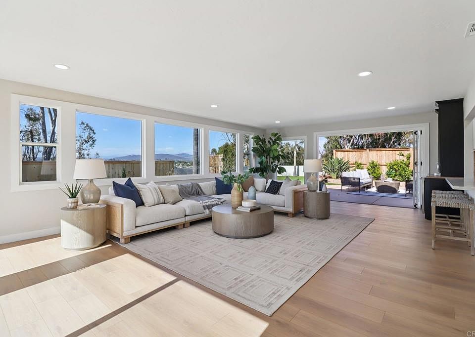 This single level Summerfield home has jumped from 1974 to a 2025 whole-home rebuild and remodel. A trumpet lot with the private back opening to two private patios and spacious pool sized yard exposing blanket mountain/city views for miles. The interior is a wide-open floorplan with the family room to the spacious kitchen with an 8-foot kitchen island the center gathering spot for family and friends. Finally, the living room is wrapped in glass to soak in the morning. Here you see the 10 foot wide floor to ceiling La Cantina door. On the other side is a patio door that connects to the master bedroom side of the home. Room for gated RV parking, maybe an ADU. 2 car garage and the front is able to park 6 cars off the street. Let’s go inside this beautiful single story whole-home remodel. Situated on an oversized lot with a pool-sized yard, a large side yard w/room for an RV, ADU or storage sheds, new fencing, plants, new roof, hardscape patios front and back, Pergola, over sized driveway with stone pavers, artificial turf, automatic drip system,garage epoxy floors, and gorgeous views of the mountains and city and that’s just outside! With beautiful finishes and upgrades throughout this home is sure to impress! Features inside include:a gourmet kitchen with high end KitchenAid appliances,Kohler fixtures throughout. Quartz Taj Mahal countertops,Gorgeous Zellige tile backsplash, Oversized eat in kitchen island, lot’s of storage, pass through serving window. Both bathrooms remodeled, w/double vanities, showers, master w/soaking tub too. Large multipurpose back room for entertaining, built in bar w/beverage center, living room/ Shiplap & Tile Fireplace. Luxury Vinyl wide Plank flooring throughout. California mudroom entry, Board and Batton wall, new paint, doors, dual pane windows, cantina door, baseboards recessed lighting, ceiling fans and more! Award winning Encinitas Union School District and San Dieguito Union High School District. Just 5 mins from Moonlight beach. Walk to shopping and restaurants. Come experience the craftsmanship, comfort and elevated design and turn this house into your home!