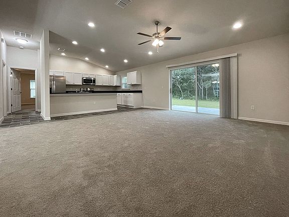 - Open-concept layout with carpeted bedrooms and living area