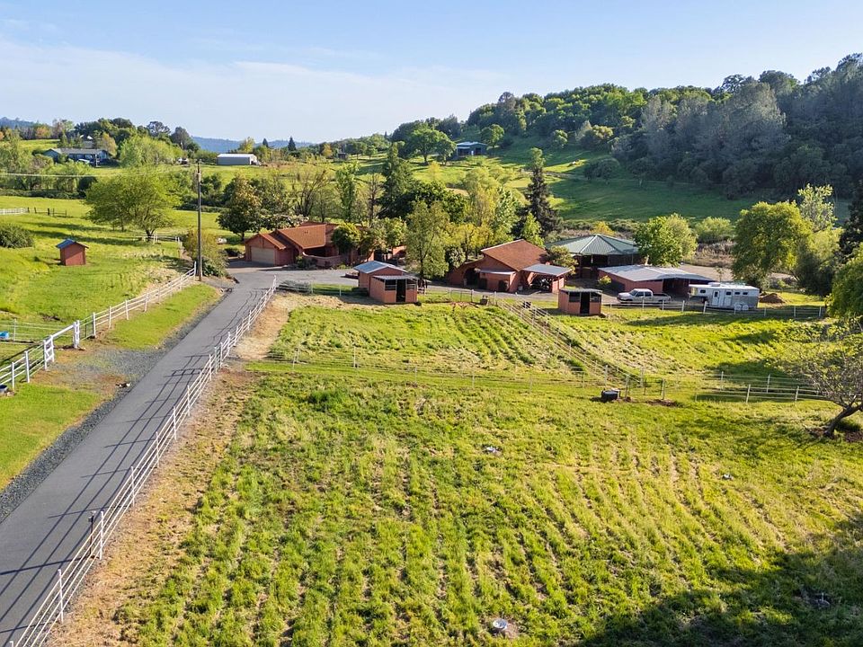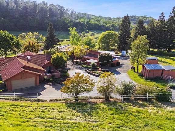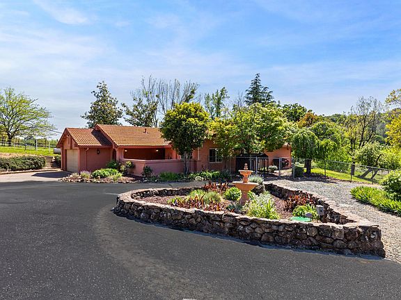 This beautiful equestrian estate on 4.65 usable acres is fully fenced and cross-fenced with gravity-flow irrigation throughout the property. Save $$ due to no pumping costs! The property has a gated, recently resealed paved driveway that leads to the custom home and 4-stall barn with matching tile roof. The charming single level, Santa Barbara style home is designed with an artistic flare, vaulted ceilings, an open concept with 2 large bedrooms, each with its own patio and 2 full baths, AND plenty enough room to add on and make it your own! The spacious kitchen has solid wood cabinets, stone countertops and stainless appliances with seating for four at the counter. As for the horse amenities, this property has it all! A 4-stall barn with tile floor tack room, a covered area for boat parking or additional equipment storage, additional 6 stall barn (could be converted to a shop), 5-ton hay barn, covered horse wash rack/shoeing area and a covered, enclosed, lighted Castlebrook round pen. Outdoor sand arena with sprinklers provides 365 days of riding opportunity! 2 grass paddocks with shelters, 3 pastures and a pond. Consider all the amenities, including STARLINK availability of this gorgeous property with its proximity to shopping and trails and you will agree,this is a rare find!