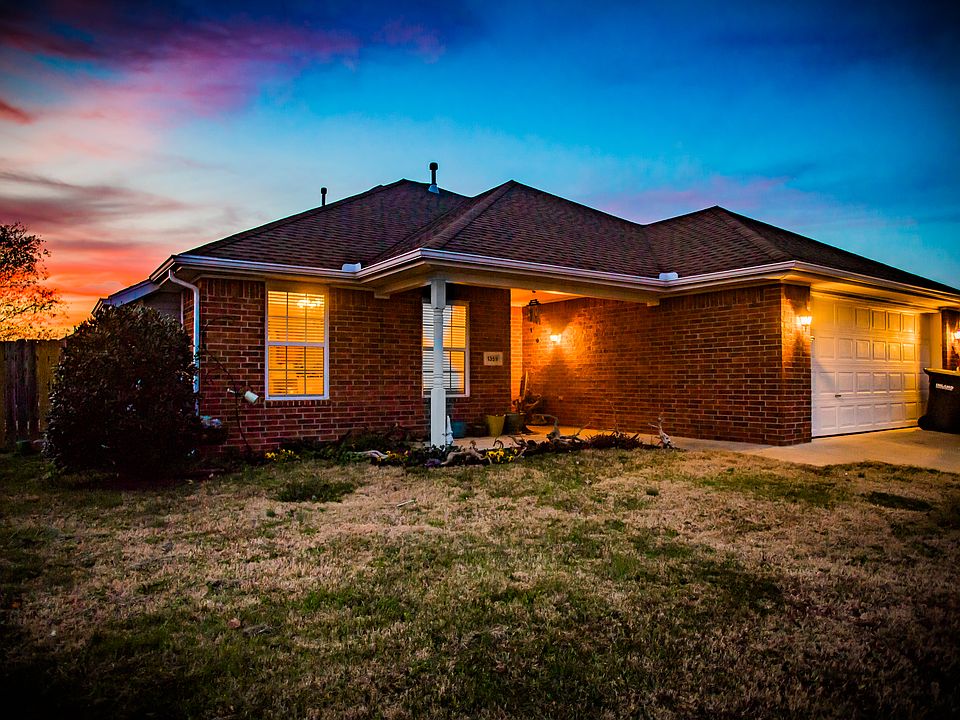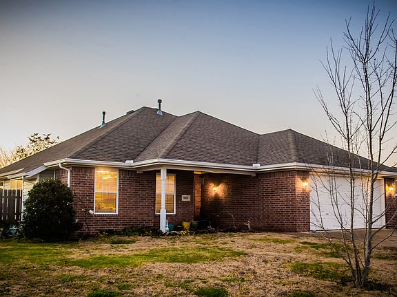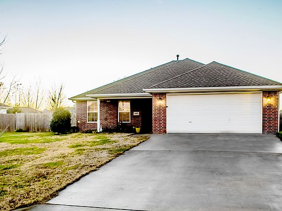 Newly painted home with stunning native stone gas fireplace and bamboo flooring in living room, master bedroom, hallway, and two hallway closets. Tile is in entryway, both bathrooms, utility closet, kitchen, pantry, dining room, and laundry room with front-loading washer and dryer. Carpet in the other two bedrooms. All appliances are included with home and in great working condition. The only appliance lacking is a kitchen refrigerator. The kitchen will have new granite counter-tops scheduled to be installed Dec. 7th. This home has plenty of storage space throughout. Two-car garage comes with shelving and a refrigerator. Beautiful sunrise view from the front porch with established flower garden complete with strawberry and blackberry plants. Backyard is fenced in and perfect for entertaining guests with sunset views on a newly done native stone patio. If interested in viewing this home, please call 479-445-3718.