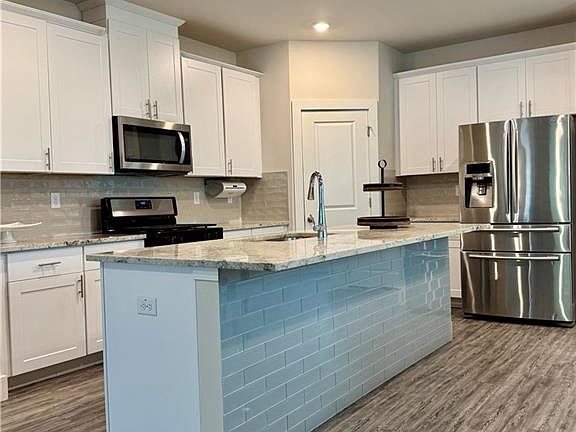 Oversized islandOpen floor planStainless steel appliancesStone countertopsSpacious kitchenMaster suiteNew tile shower