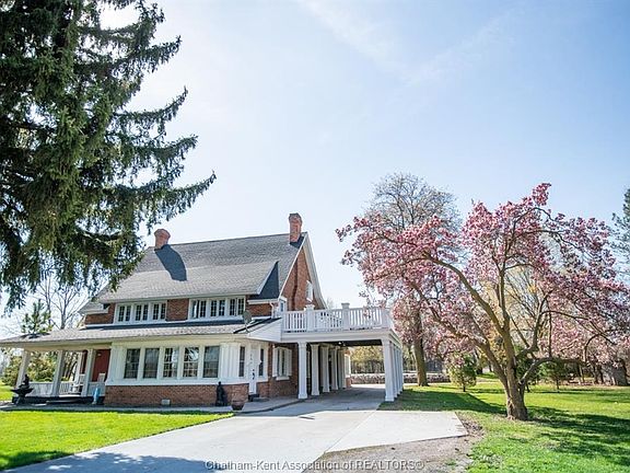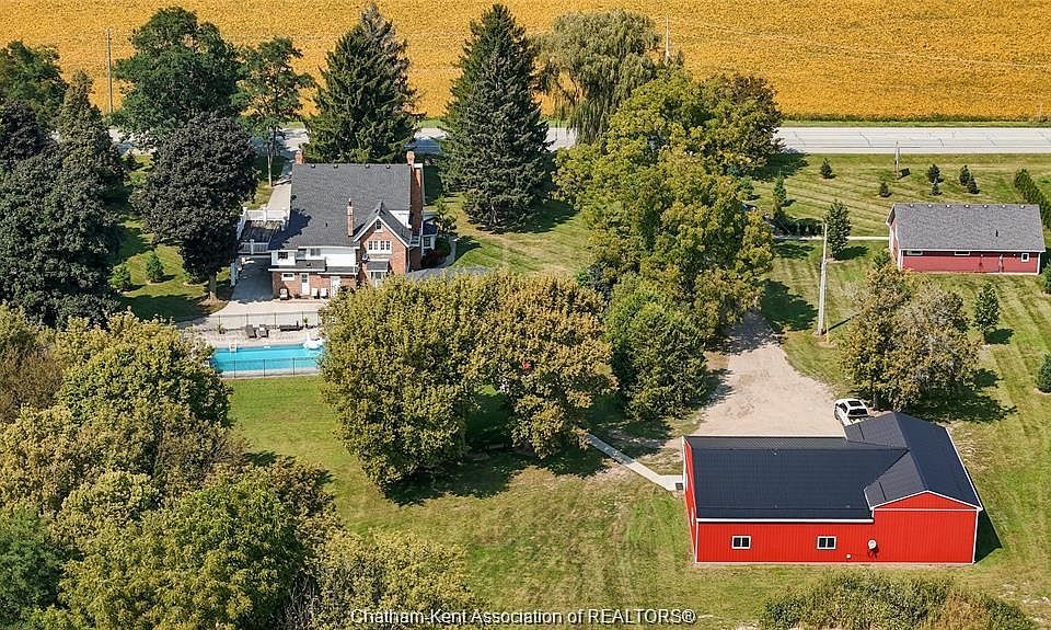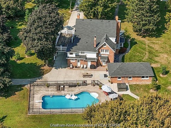 Step into timeless elegance with this rare 16-acre property set along the scenic Thames River. Built in 1861, this plantation-style residence showcases unmistakable southern charm while offering modern conveniences for today’s lifestyle. Spanning 2.5 stories, it features 5 bedrooms and 2 bathrooms. The spacious eat-in kitchen is a true showpiece with granite countertops, a large island, and plenty of room for family gatherings. The inviting living room is centered around a cozy gas fireplace—perfect for relaxed evenings. Upstairs, the primary bedroom includes a private balcony overlooking the lush property, an ideal spot to enjoy your morning coffee. Outside, the grounds are just as impressive. Enjoy a heated inground pool (installed in 2015), a soothing hot tub, and picturesque walking trails that wind through nature and lead right to the river’s edge. A 64'x48' heated shop, built in 2016, provides abundant space for hobbies, storage, or large equipment, ideal for entrepreneurs or hobby farmers. There’s also a separate studio or office with its own private entrance, perfect for a home business, guest suite, or creative workspace. The property includes 11 acres of workable land, offering potential for rental income, hobby farming, or conversion back to pasture for livestock. Over the years, this home has seen numerous thoughtful updates, blending historic architecture with functional modern living. Located between Chatham and London, and just a quick 10-minute drive to Hwy 401, this exceptional property offers the best of both worlds: peaceful country living with easy access to major routes. Whether you’re dreaming of a family retreat, a hobby farm, or a place to run your business from home, this property is truly one of a kind.