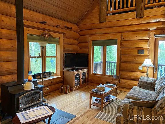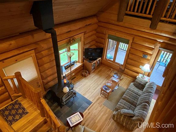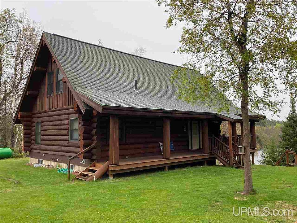 Gorgeous log home with 1600 feet of scenic frontage on the Michigamme River. From the wraparound porch, you enter the main floor with an open concept living room and kitchen. The main floor also features a cozy wood fireplace, one bedroom and a large bathroom with a soaking tub and laundry. Take the log staircase to the second floor and cross the decorative walkway to the open loft that could be used as an additional bedroom with amazing Crow's Nest views of the river. Additionally, there is a bedroom on the second floor. The lower level is an unfinished walkout to the waterside of the home. Outside is a storage building and oversized two car garage. Enjoy privacy, great fishing and hunting in this amazing location. This home is close to many great fishing lakes, creeks, streams and commercial forest land all open to the public.