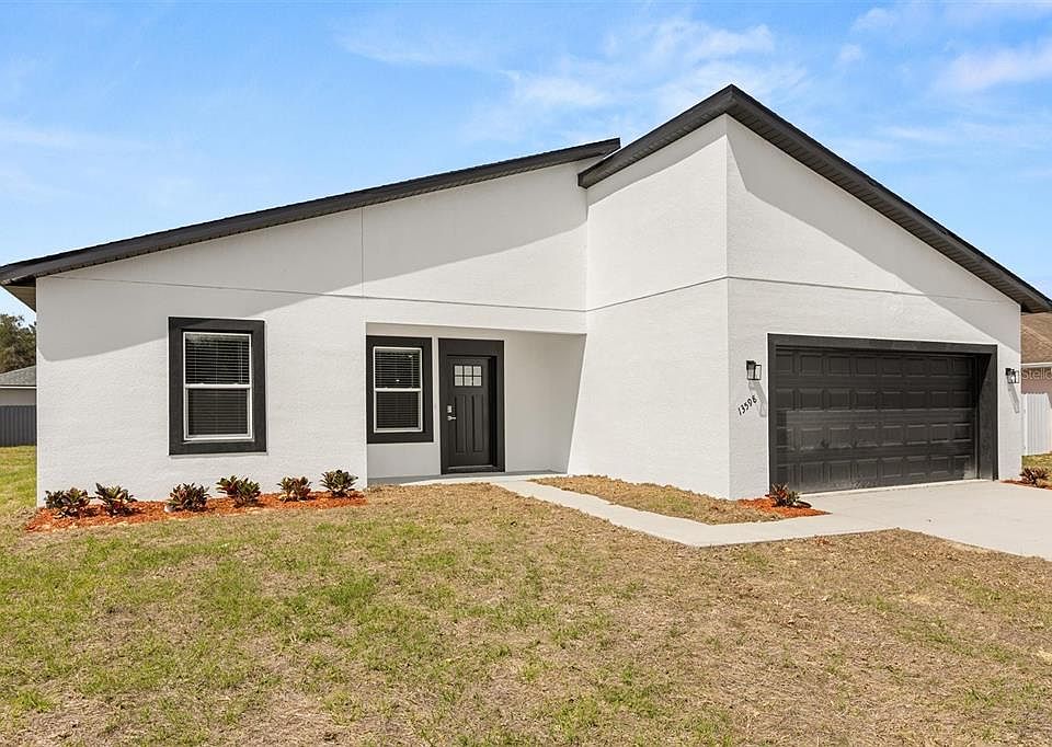 Space, style and a location you'll love at a great price point! Be the first to occupy this new 4/2 with 2-car garage, located on a circle in a quiet neighborhood. As you enter, you will notice that the high ceilings throughout lend to the open feel of the home. The kitchen offers generous lighting, quartz counters, upgraded SS appliances and a pantry closet. There is luxury vinyl plank flooring throughout the home, except for the Primary Bathroom. The Primary Bath offers everything you could ask for: Separate room for water closet, a shower, separate soaking tub, higher double vanity with quartz counter and lots of space. There are window treatments throughout the home as well. You will love the location of this home in Marion Oaks Unit 1. It is at the front of the subdivision, just two miles from I-75 and less than a mile to the new Aldi’s, only three minutes away! The building site of Marion Oaks new Publix is just six minutes away. Marion County’s newest high school is under construction in Marion Oaks, just four miles away. All of this, and it is under a 1-year full Builder’s Warranty, with a 2-10 extended warranty. Come see this beautiful home in a growing area. You will want to make it yours! Seller is a licensed Realtor.