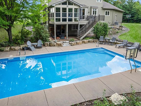 Welcome to a home that combines elegance, comfort, and incredible outdoor living. Set on 3+ private acres near Stonebrooke Golf Club, this 4-bedroom, 4-bath residence offers a backyard retreat with a heated saltwater pool, sport court, firepit, and maintenance-free deck—perfect for entertaining or relaxing in style. Inside, a two-story foyer with hardwood floors opens to a sun-filled living room with a gas fireplace, a main floor office, and a three-season porch. The gourmet kitchen features hickory cabinets, granite counters, stainless steel appliances, and an adjacent laundry/mud room with custom cabinetry. Upstairs, you’ll find spacious bedrooms with walk-in closets and heated tile floors in all baths, including the serene primary suite with its own fireplace. The walk-out lower level expands your living space with a large family room featuring a stone fireplace, custom built-ins, and a 4th bedroom with an ensuite bath. This is the perfect blend of privacy, space, and high-end living.