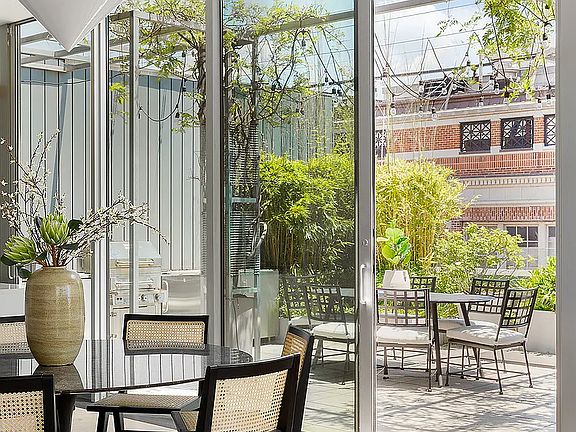 A modernist glass jewel box set atop a converted warehouse, Penthouse B at 136 Baxter Street is a rare offering on the dynamic intersection of Soho, Nolita and Chinatown. Tucked away on Baxter Street - one of downtown's in-the-know enclaves - this three-bedroom, three-bathroom duplex residence seamlessly integrates a modern loft in the sky with sought after prewar details.
