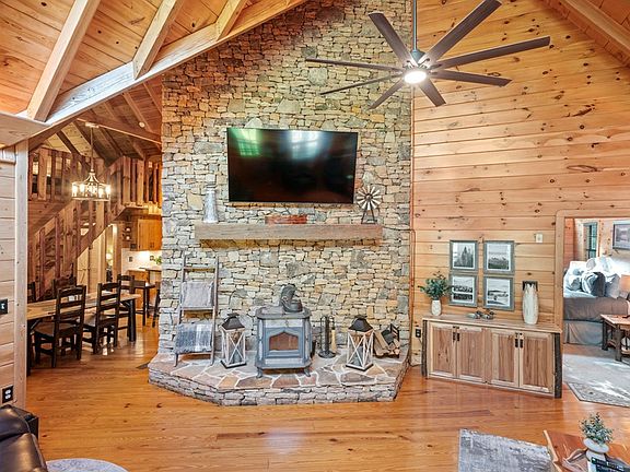 Welcome to your own slice of paradise nestled in the Cherry Log Mountain community! This unique property boasts 1.5 acres of tranquil beauty, situated along 300+ feet of Cherry Log Trout Creek, with its very own private lake, including a private dock. Step inside to discover this charming private cabin, offering a perfect blend of rustic charm and modern convenience. The highlight of this cabin is the massive primary bedroom flooded with natural light from numerous windows, creating a serene oasis for relaxation. Cozy up by the stack stone fireplaces on chilly evenings or step outside onto the back porch to unwind in the soothing hot tub. The open-concept living area provides a seamless flow between the kitchen, dining, and living spaces, ideal for entertaining guests or simply enjoying quality time with loved ones. The kitchen features stainless steel appliances, adding a touch of elegance to the rustic ambiance. Conveniently located just 10 minutes away from both Blue Ridge and Ellijay, this property offers the perfect balance of privacy and accessibility to amenities and attractions. Whether you're seeking a weekend getaway, a short-term rental business or a permanent residence, this property offers endless possibilities for creating cherished memories in the heart of nature. This properties will generate $100k+ annually with rental income, with a very high occupancy rate. The location is the best in all of Blue Ridge. Don't miss out on the opportunity to make this idyllic retreat or turn-key successful cabin rental business your own!