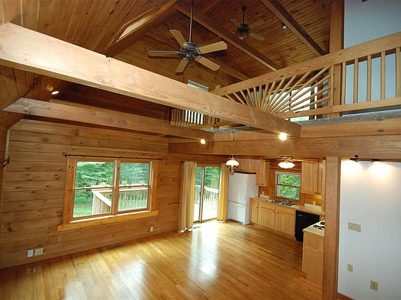REDUCED PRICE !!! Custom designed Tennessee log home with D-log style for flat interior finish. Open floor plan with vaulted ceilings and skylights. Exposed beams. NEW carpet in the bedrooms and loft. The loft is open to the lower level and private deck. Master suite has exposed beams and large walk in closet. The basement is finished with a free standing gas fireplace. Great 5.59 acre lot with mountain views. The property around the house is cleared for play and has a woven fencing plus invisible dog fencing (collars stay). Paved Drive. 25 gal per minute well. Private and peaceful.