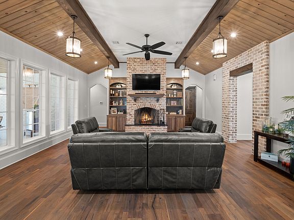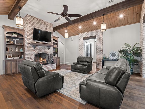 The inviting custom floor plan includes an immaculate interior which combining entertainment spaces, flow-through living/dining area, home office. Brick fireplace. Have all the counter space you need in this chef-inspired kitchen that boasts top-of-the-line appliances, granite countertops, large center island, custom-made cabinets and a large walk-in pantry. The main bedroom is comfortable, and affords a luxury bathroom and a designer closet. The main bathroom features a custom shower and his-and-hers sinks. Host a party in the relaxing backyard, which features a BBQ area, bar, a pond for fishing, and well-established trees. The perfect location for outdoor fun on 12.6 acres. A short distance from town, Spend time in the large 32x40 shop with tractor and mower to remain.