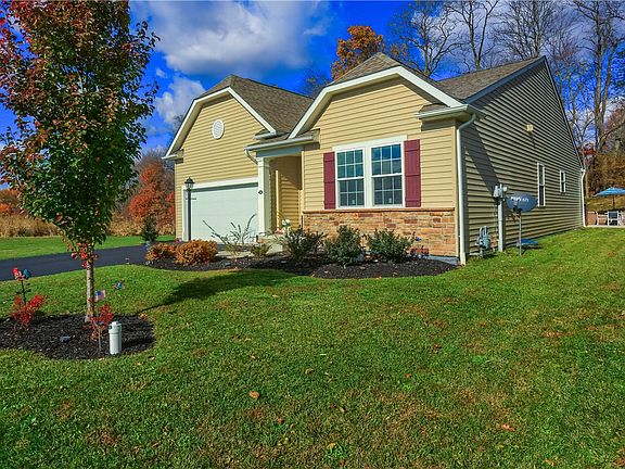 Tucked away on a private cul-de-sac with its own wooded homesite, this beautiful four-year-old ranch home offers privacy, comfort, and modern design. LVT flooring flows throughout the main living areas, leading to a stunning kitchen with custom cabinetry, granite countertops, tile backsplash, and an oversized island open to the dining area and family room. The dining area opens to a large composite deck that steps down to a concrete patio surrounded by professional landscaping. The primary suite features a walk-in closet and bath with double vanity and custom-tiled shower. A versatile front room with French doors can serve as a den or guest bedroom. The expansive unfinished basement with plumbing for a full bath offers endless potential. Conveniently located to the charming towns of Evans City, Zelienople, and Harmony. Also easy access to all major roadways and interstates making travel to Butler and Pittsburgh easy and convenient. Gas hook ups for stove and dryer available.