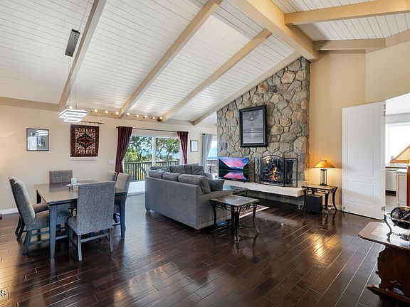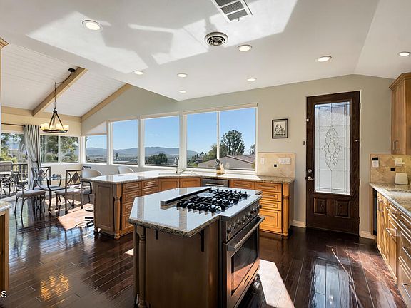 Perched in the prestigious Las Posas Estates, this remarkable hillside residence captures sweeping views of the city, mountains, and ocean--creating an entertainer's paradise in an atmosphere of tranquility and sophistication. Nestled on a quiet cul-de-sac street, this custom-designed home seamlessly blends refined elegance with effortless comfort. The main level features three spacious en-suite bedrooms, with the primary bedroom designed to take advantage of the home's stunning vistas. The gourmet kitchen is a culinary dream, showcasing a commercial-sized refrigerator and freezer, professional-grade gas range, walk-in pantry, granite countertops, and an inviting eat-at counter. Morning light pours through expansive windows, illuminating the open-concept living and dining areas that flow effortlessly to wrap-around decks--ideal for indoor-outdoor entertaining. The primary suite is a serene retreat with vaulted wood beam ceilings and dramatic picture windows framing the breathtaking views. Downstairs, a stylish speakeasy bar with tin ceiling plus bonus room with a dedicated powder room set the stage for memorable gatherings, while sliding glass doors open to a spacious patio complete with a firepit and outdoor lounge. Downstairs also includes a fourth bedroom or office plus a 3/4 bath. Film enthusiasts will enjoy the dedicated media room with cozy, oversized theater seating, a 96' screen, and projector. For car collectors and hobbyists, the property offers exceptional amenities--including a generous three-car garage, separate storage/workroom large enough to accommodate another vehicle, and a large gardening workshop in addition to an outbuilding with car lifts capable of accommodating up to six vehicles and its own solar system. Meticulously maintained and thoughtfully upgraded, the home features high-end amenities such as owned solar, EV charging, whole house back up generator, recirculating hot water, custom blinds, gutter guards, and paver driveways and patios. The circular driveway provides a grand entrance, complemented by space for RV or boat parking. Coming in at just over an acre, the property can accommodate extra cars, toys, and fun. Just minutes from Camarillo's premier golf clubs and conveniently located between Santa Barbara and Los Angeles, this one-of-a-kind estate offers unparalleled privacy, craftsmanship, and comfort--with views that inspire, and spaces that invite you to live beautifully.