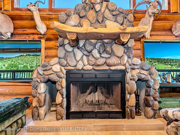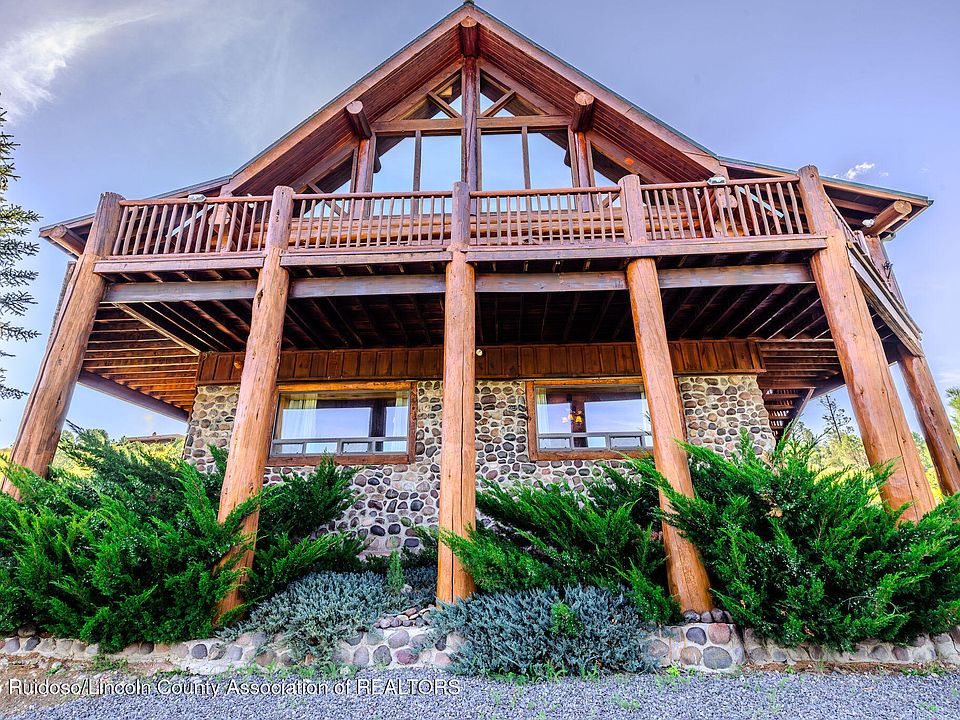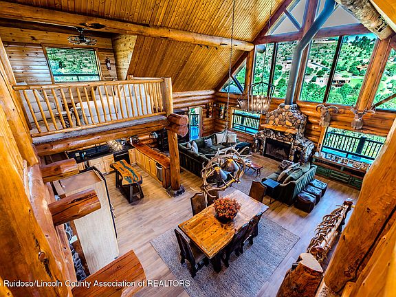 This fully furnished log home, over 4500 Sq. Ft. (according to tax records) includes a golf membership at Alto Lakes Golf & Country Club and charming artwork. Recent updates feature new staining, paint, flooring, and mini-split systems. The kitchen appliances, bathroom vanities, and lighting fixtures are all new, making it move-in ready. Sitting on an acre, it boasts unique details like hand-peeled Canadian lodge poles, a river rock fireplace with views, and a spacious great room. The main level master suite has a sunroom and laundry area. Enjoy 1,000 Sq. Ft. of covered decks with 300-degree views of the Capitans, mountains, valley, and Sierra Blanca. Upstairs are two guest bedrooms, a bath, a loft office, and a garage shop area.