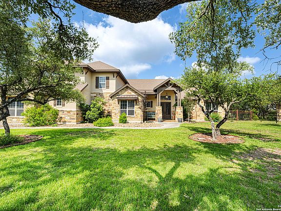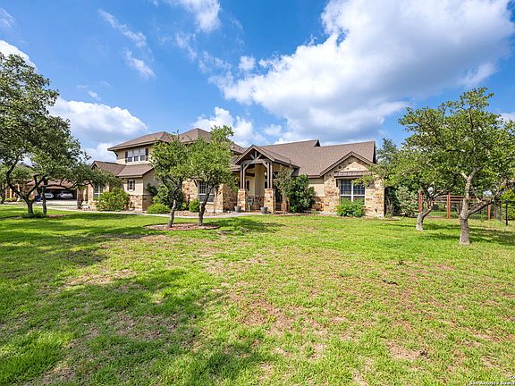 Breathtaking views and a stunning home design on just under 2 acres in River Crossing! Wow, the incredible attention to detail and brilliant layout will have you in awe. The open living room and kitchen create a perfect space for your family time. Enjoy eating your meals in the open dining area or on the huge bar top. You'll want to cook every meal in the over-sized custom kitchen with a large island, double ovens, a coffee bar, a wet bar and plenty of storage. The separate master suite has plenty of windows for natural light and relaxing views. The master bath and closet belong in a 5 star hotel! You'll find separate vanities, an over-sized walk in shower, a huge bath tub and a stunning design. The master closet is massive and has access to the amazing laundry room. The 2 secondary bedrooms have a jack & jill bathroom, large closets and plenty of privacy. Upstairs is a cozy media room and a walk in attic large enough for all your extra storage needs. With tons of space to entertain and relax outside, this custom homes boasts TX Hill Country views in the front and back yard, fully custom metal fencing, more manacured oaks than you can count, multiple decks and a built in hot tub with a side bar top, and a nice hilltop breeze any time of the day. 2 instant water heaters, irrigation in the front & back, oversized 3 car garege, tons of parking and much more! River Crossing amenities include a golf course, workout facility, pool, Guadalupe River acces, walking trails the best TX Hill Country living